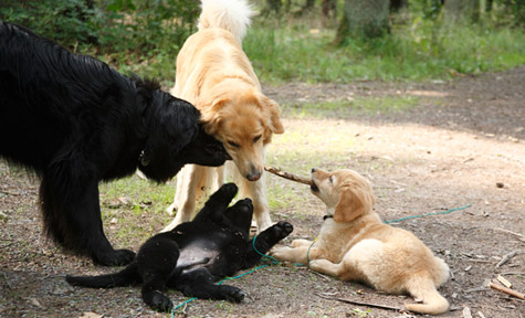 Was geschieht in den ersten acht Wochen beim Züchter? In der Regel trägt die Hündin 60 bis 63 Tage. Bei der Geburt wiegt ein Welpe zwischen 300 und 500 Gramm. Die Mutterhündin kümmert sich von der ersten Minute seines Lebens um den Welpen. Durch Lecken regt die Hündin den Kreislauf an und durchtrennt geschickt die Nabelschnur. Der Welpe krabbelt vom Geruchsinn geleitet und durch Wärmeempfinden zielstrebig zum Gesäuge der Mutter. Seine Augen und Ohren sind noch fest verschlossen. Schon in der ersten Woche beginnt der Kampf um die besten Zitzen und nach dem Säugen kuscheln sich alle Welpen zusammen und schlafen erschöpft ein. Eine wichtige Rolle spielt das Ablecken von Bauch und Hinterteil. Dadurch wird das Entleeren von Blase und Darm angeregt. Nach einer Woche haben die Kleinen bereits ihr Geburtsgewicht verdoppelt und am Ende der zweiten Woche öffnen sich Augen und Ohren. In der dritten Woche verlassen sie mutig die Wurfkiste und erkunden vorsichtig ihre nächste Umgebung. Das Immunsystem ist in den ersten drei Wochen noch nicht kräftig genug um etwaigen Infektionskrankheiten Stand zu halten. Haben Sie als Welpeninteressent bitte Verständnis dafür, dass Sie die Kleinen noch nicht besuchen können. Nach vier Wochen beginnt die Prägungsphase des Welpen. Seine Sinne sind nun voll ausgebildet, er hat inzwischen Zähnchen bekommen und ist entwurmt worden. Nun gibt es nebst der Muttermilch auch feste Nahrung und es ist lustig anzuschauen, wie die kleinen Hunde den Brei auf Boden und Geschwister verteilen. Die Mutter verbringt nun weniger Zeit mit den Welpen. Für den Züchter kommt jetzt die Zeit, in der er mehr Arbeit mit den Welpen hat, da er sich mit der Reinigung der Wurfkiste und der Welpen bisher auf die Hündin verlassen konnte. Unter den Welpen beginnen intensive Kontakte und spielerische Rangeleien. Mit der fünften Woche starten die Welpen ihre ersten Erkundigungen im Freien. Um in der Prägungsphase möglichst viele Erfahrungen zu machen, wird verschiedenes Spielzeug bereit gestellt. Unsere Welpen werden in dieser Zeit auf eine Pfeife konditioniert, indem vor jeder Mahlzeit gepfiffen wird. Sie verbinden mit diesem Zeichen ein positives Ereignis und kommen in freudiger Erwartung zu ihrem Züchter und später auch zum Welpenbesitzer. Kontakt zu Menschen ist in unserer Aufzucht schon durch die große Familie und die hundelieben Nachbarn gegeben. Außerdem freuen wir uns auch sehr, wenn Sie als zukünftiger Welpenbesitzer öfter vorbeischauen. Werden die Welpen in der neunten Woche abgegeben, sind sie geimpft, gechipt, entwurmt und besitzen eine VDH Ahnentafel. |